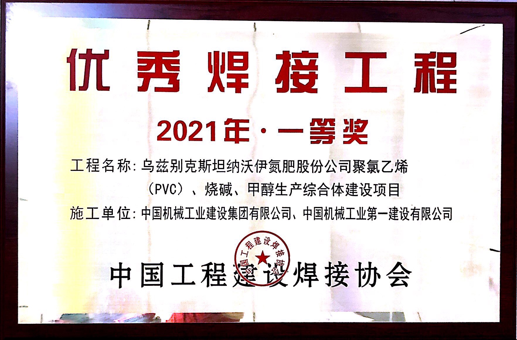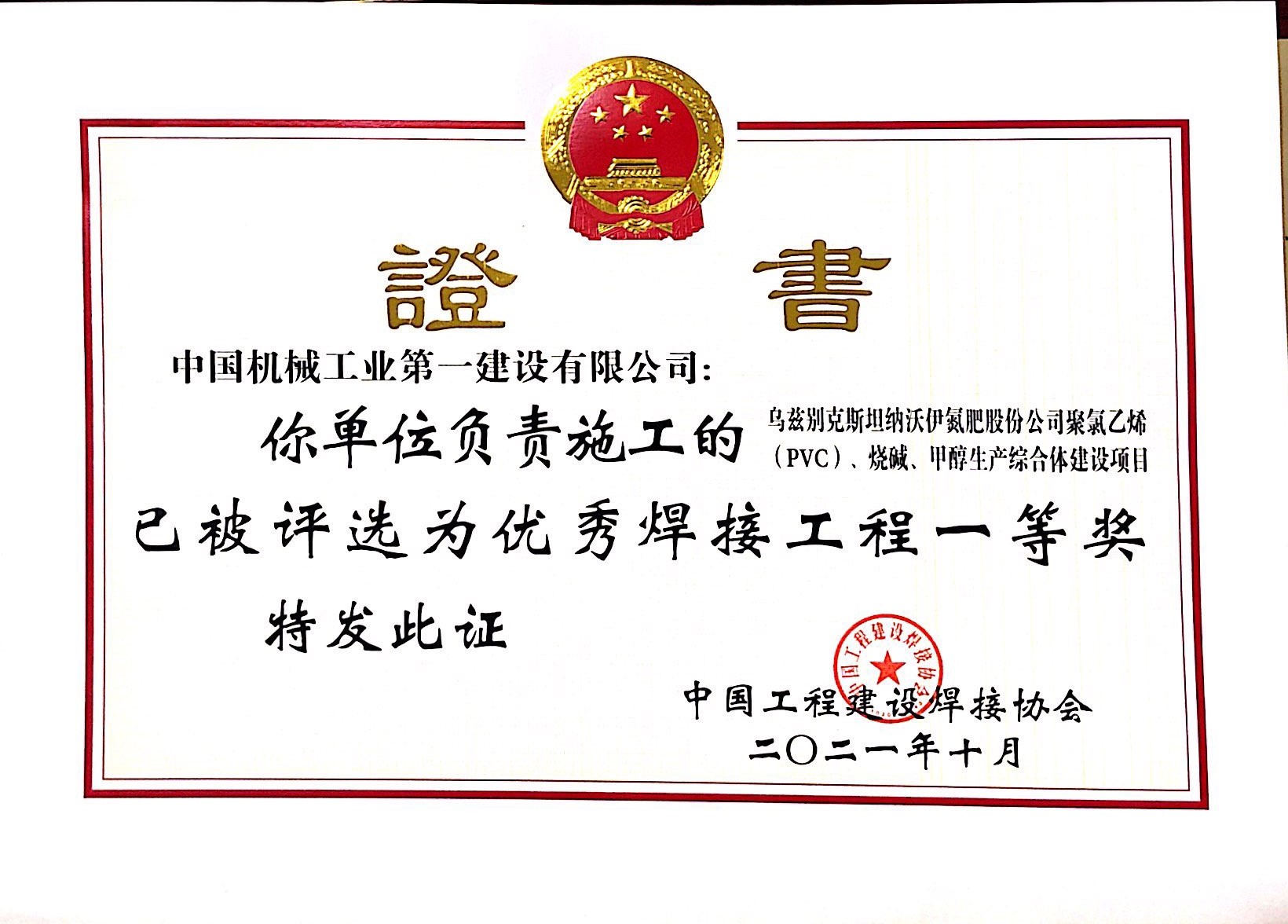 2021年优秀焊接工程一等奖证书-乌兹别克斯坦纳沃伊氮肥股份公司聚氯乙烯(pvc)、烧碱、甲醇生产综合体建设项目